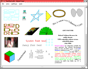 All of the standard Draw objects, and the additional ones provided by Vector, are supported and displayed. There are some features that it is not possible to reproduce exactly, due to limitations in the Qt library or the underlying platform, but the results obtained should be as close as it is possible to achieve. These are: