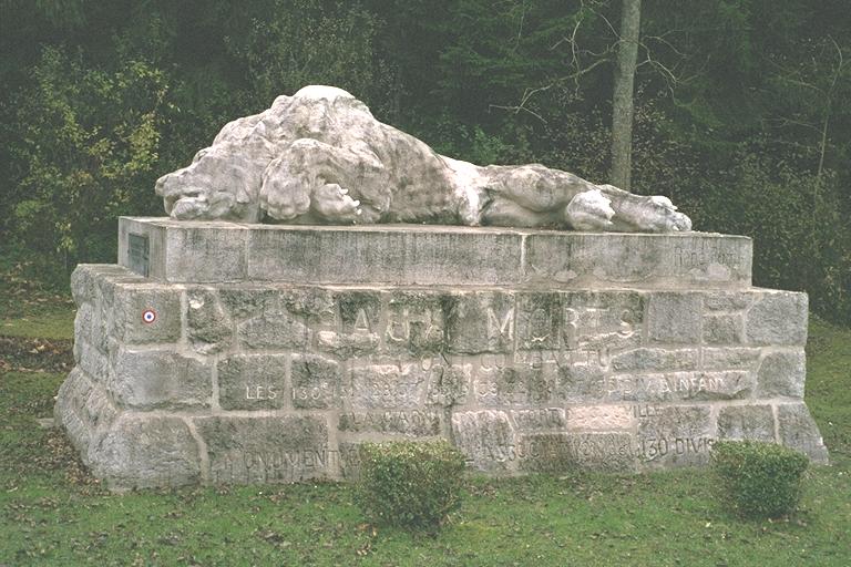 The "Wounded Lion" at the crossroads (89K JPEG) | The road led into the quiet forest, at first glance no different from any other. But, on looking more closely, the reminders of those days are still here: hidden among the trees just alongside the road was a concrete «Pamard» blockhouse («casemate»), one of a long line of them defending the «Fort de Souville» atop the small hill to the west. Mostly buried below ground level and only just big enough for a few men and some guns (their mountings were still visible through the tiny windows), it must have been a terrifying experience to face the German assault that July, having already been subjected to several months of artillery bombardment and then fire and gas attacks. However, the handful of men remaining with their outdated weapons did succeed in stopping the attack; just slightly further to the west, at the junction of the D913 and D112 roads, was the "Wounded Lion" memorial marking the furthest point of the German advance. Von Falkenhayn's army never recovered from being halted there, and never reached the town of Verdun: although they did succeed in crossing the river valley some way to the north, by then it was far too late to take the advantage and their advance westwards effectively ended here. | |||
