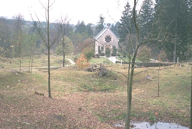 All that remains of the village today is a grassy slope leading downwards from the road, with a few stone walls standing. The remainder of the site is still covered with holes and shell craters (now smooth and grass-covered, of course, but recognisable for what they are). Some of the remains of the buildings are marked by plaques; without those there would be no chance of identifying what once stood here, or even that there had been a village at all. The only building still standing was the church (also reconstructed, of course, after the war had ended) where "Our Lady of Europe" watches over the site. It was time to start heading back to the hotel for tonight. There were a number of ways to go from here, but I continued along the same road which turned past the «Ossuaire de Douaumont». As its name implies, this is where the unidentifiable bodies and bones collected from the battlefields now reside - several hundred thousand of them, French, German and many other nationalities all alike. Leading down the hill from the front of the «Ossuaire» were the endless lines of crosses for those that could be identified (but not all by any means: there are some sixty other military cemeteries to be found in the Verdun region alone). In a small area at the head of the field, there was the unusual sight of some Muslim graves - their occupants having obviously followed the call, from some distant colony, to defend their then countrymen's homeland. Their minaret-shaped stones, inscribed in Arabic of course, were turned to face towards Mecca rather than eastwards as did their Christian comrades'. | |||