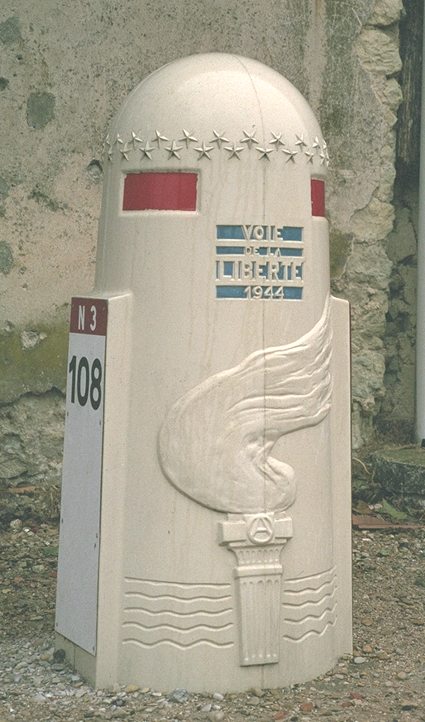 Milestone along the road at la Grange-aux-Bois (69K JPEG) | After descending from the hill I continued westwards, through Varennes-en-Argonne and the woods to its south before rejoining the main road at les Islettes. The milestones (yes, I know that's not the right word!) along this road were in the shape of a shell case, commemorating the Allies' march towards victory in the closing stages of WW II; the exhausted soldiers from the WW I front must have taken much the same route when they were finally able to turn around and head for home. From here I retraced my route of earlier today - there were again a few blockages on the main junctions leading into the city, but nothing particularly serious - and I arrived back at the hotel about teatime for a well-earned rest. | |||